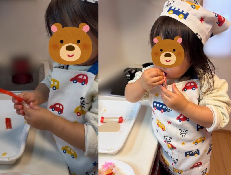 カニカマのビニールを剥がして割く作業も、つまむ・絞りだすという動作で指先のいい運動になります。