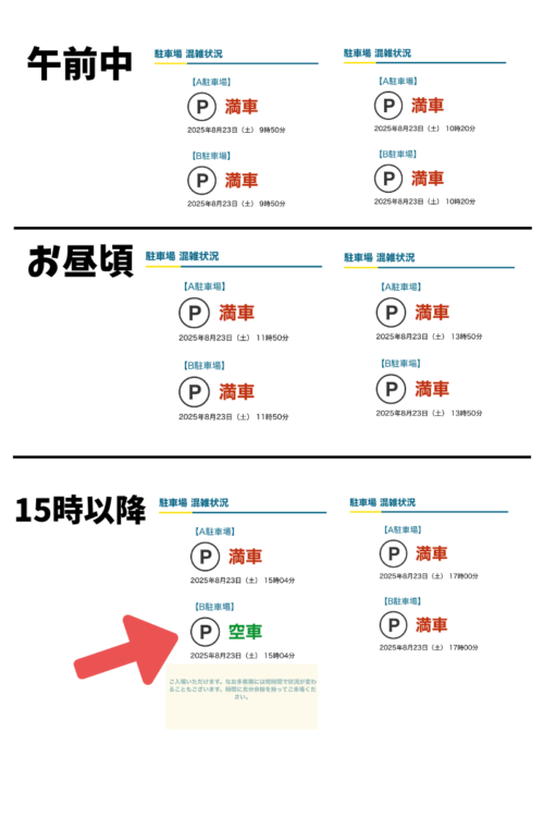 • 朝からほぼ「満車」。15時ごろに一瞬だけB駐車場が「空車」表示に。